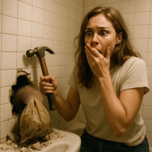 While my husband was not at home, my father-in-law told me to take a hammer and break the tile behind the toilet: behind…