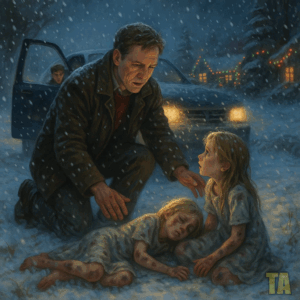Ronald Ashton’s headlights caught through the blinding Christmas Eve snow, revealing something that made his blood run cold. Two small figures collapsed on…