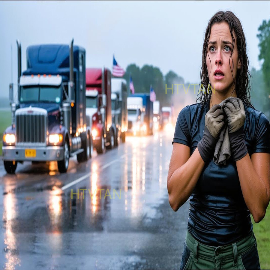 Rain poured as Jenna knelt beside the broken rig, her clothes soaked, hands steady. She fixed his brakes without asking his name. Just wanted him to get home safe. Weeks later, she heard a rumble outside her small town garage and froze. A convoy of trucks stretched down the highway, headlights glowing, engines humming like a hymn.