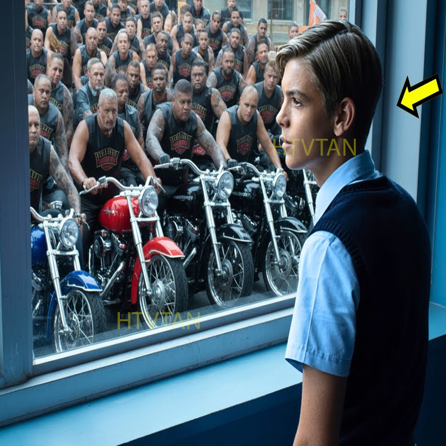He counts them as they arrive. 30, 40, maybe 50 Harley-Davidsons arranged in perfect formation, like an army that’s come not for conquest, but for something far more personal. Their engines cut off in synchronized silence. And suddenly, the only sounds are raindrops hitting leather and the distant murmur of students gathering at classroom windows, their faces pressed against glass like spectators at an aquarium.