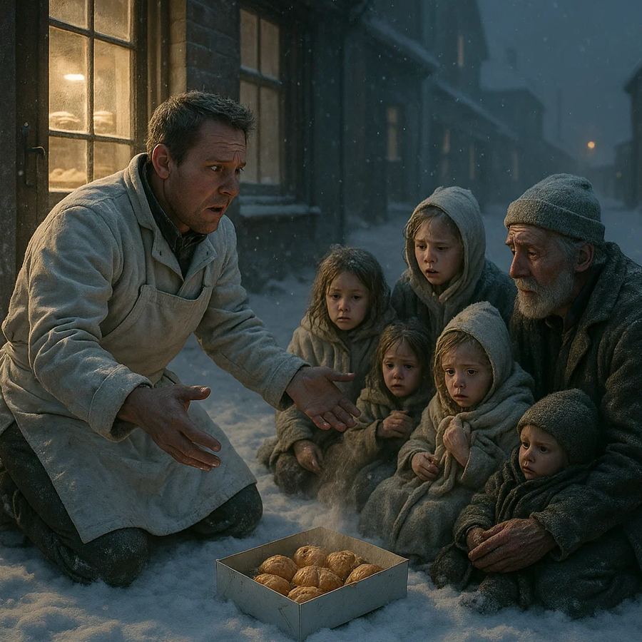 This morning, as usual, Michael stepped outside to shovel the snow in front of the bakery. However, right at the doorstep, he froze when he saw a large cardboard box. What’s this? Michael murmured, frowning. The box looked old and worn with one corner torn. Michael bent down to check it, and as he lifted the lid, he was stunned by what he saw. Inside were four children shivering from the cold.
