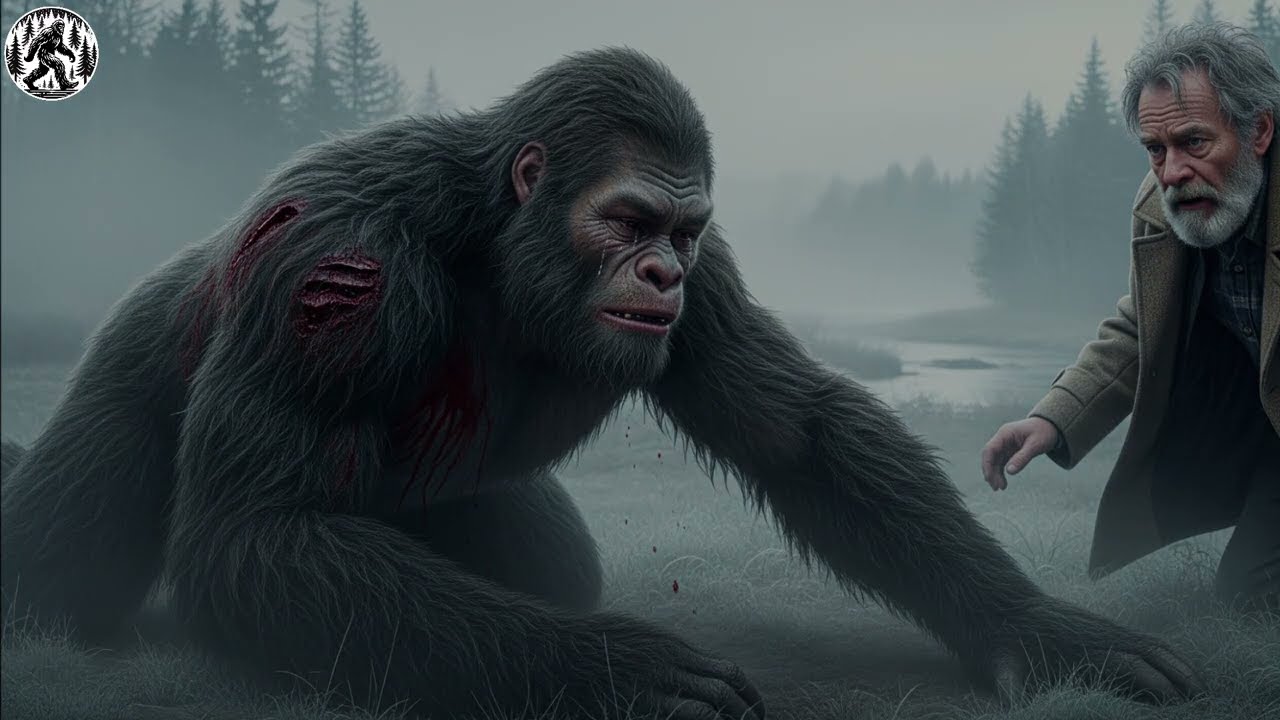 It was something far bigger. The figure stepped out of the fog, and Harold saw it clearly. A Bigfoot, a giant covered in thick, dark brown fur. But this creature was hurt badly hurt. Its fur was matted with blood, and a deep wound ran along its side. The Bigfoot stumbled and fell to its knees, then collapsed heavily against the door of Harold’s hut.