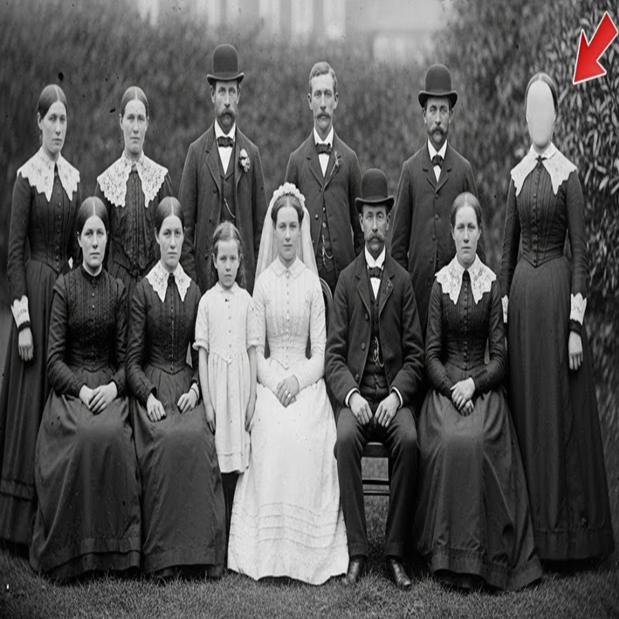 Because when forensic experts finally analyzed every microscopic detail of this seemingly innocent wedding photograph, they discovered that one person in the image standing in clear view among the wedding party has no face. Not a blurred face, not a damaged face, not a face obscured by shadow or motion, but rather where a human face should be. There is only absence.