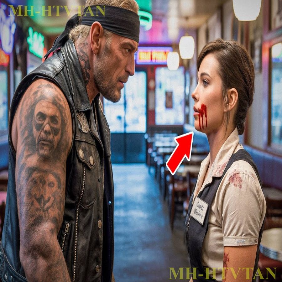 Inside the diner, the clinking of coffee cups faded as the bikers took their seats. The waitress, her name tag read Emma, moved quietly between tables, her smile polite but weary. She was young, maybe 28, with tired eyes that held the weight of too many sleepless nights. When she leaned forward to pour coffee, Reaper noticed something beneath her attempt at cheer.