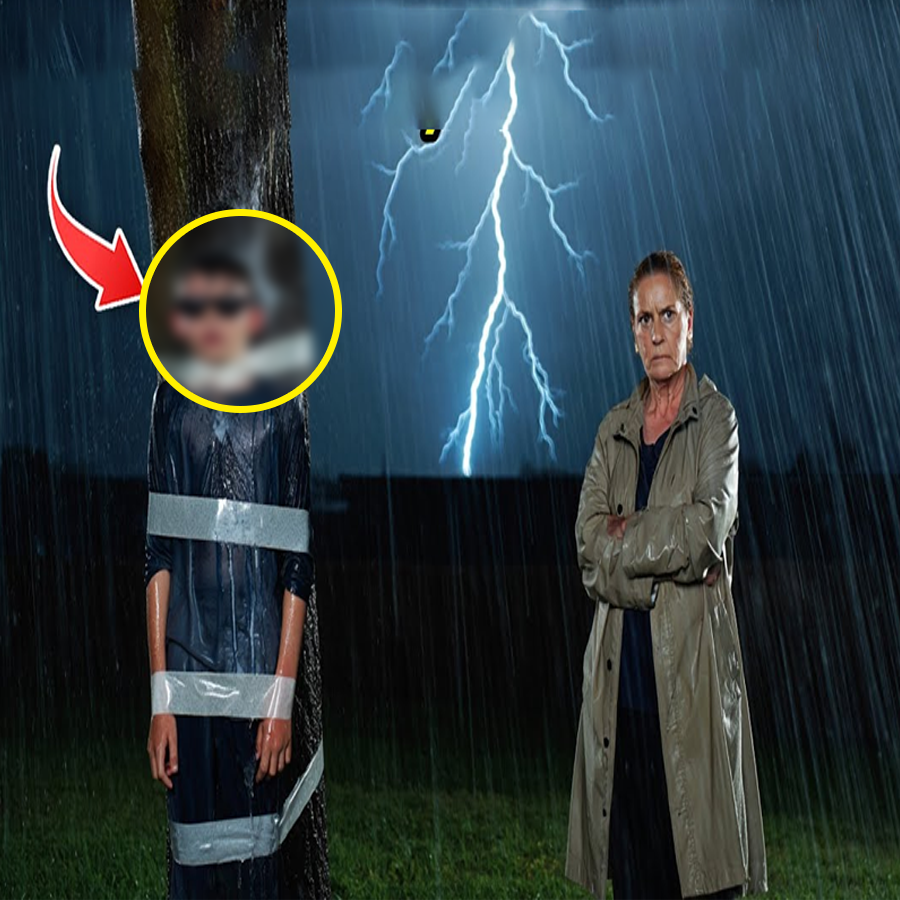 I bolted into the trees. The storm roared above. Branches snapped. My shirt clung to me like a second skin. Mud sucked at my boots. Then I saw it. a shape small, slumped, unmoving, taped to a pine tree. My son, his arms were pulled behind him. Duct tape wrapped around his chest and legs, binding him to the bark.