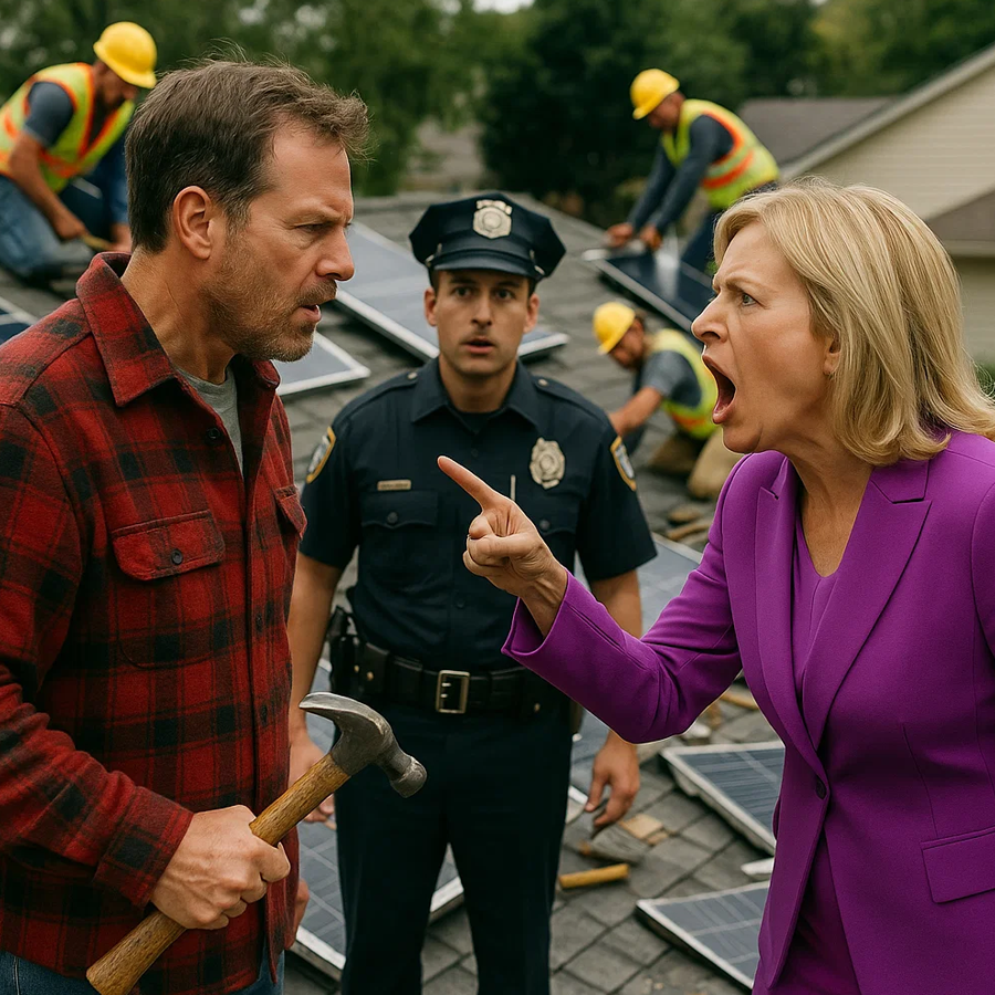 The TV camera panned across faces, angry, curious, afraid, hopeful. Three months ago, I installed solar panels. County approved, professionally installed, fully permitted. The next morning, I woke up to three workers ripping them off my roof with crowbars. Harland clicked to photos of the destruction. Shattered glass, dangling wires, roof torn open like a wound.