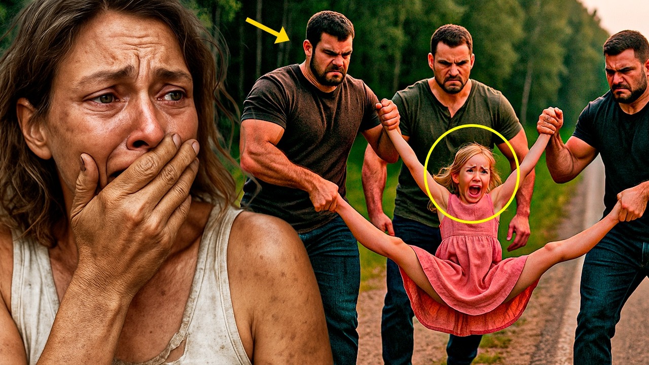 She didn’t have to go far before witnessing a scene that turned her stomach. Hidden behind a thick tree trunk, she spotted three men. Three towering, brutal figures with grim faces. One of them, the largest, had a scruffy beard and a threatening glare. He was holding a little girl by the arms. She had messy blonde hair, about 10 years old.