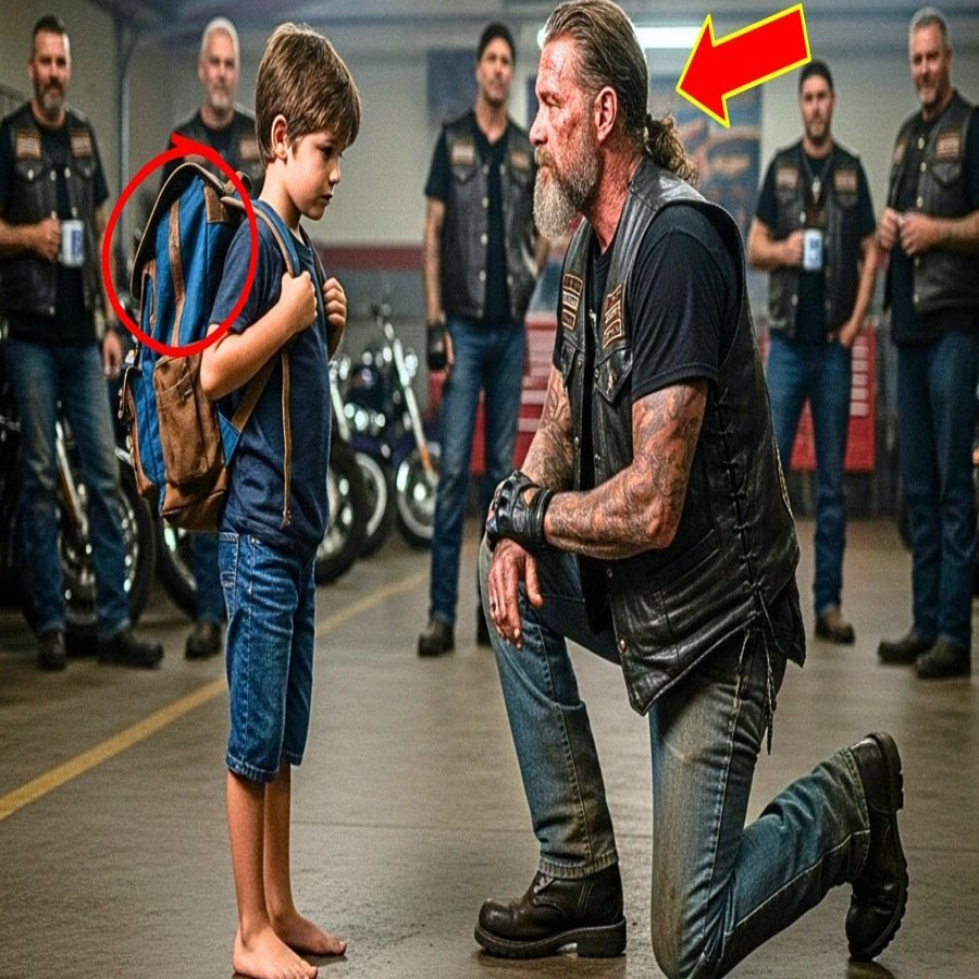At 2:00 in the morning, the steel doors of a biker garage banged open, and a six-year-old boy stumbled inside, barefoot, face stre with dirt, clutching a blue backpack almost bigger than his body. His voice tore through the roar of Harley engines like a gunshot. Hide me from my dad.