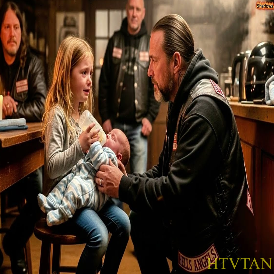 The shop lights hummed in the midnight quiet when a tiny fist tapped the steel door. “Owen Slate Mercer, Hell’s Angel’s captain, opened it to a barefoot girl clutching a blue bottle. Do you have milk?” she whispered, voice shaking. “Please, my baby brother’s dying,” the outlaw’s face changed. “Get inside. Welcome to Shadows of Dignity.