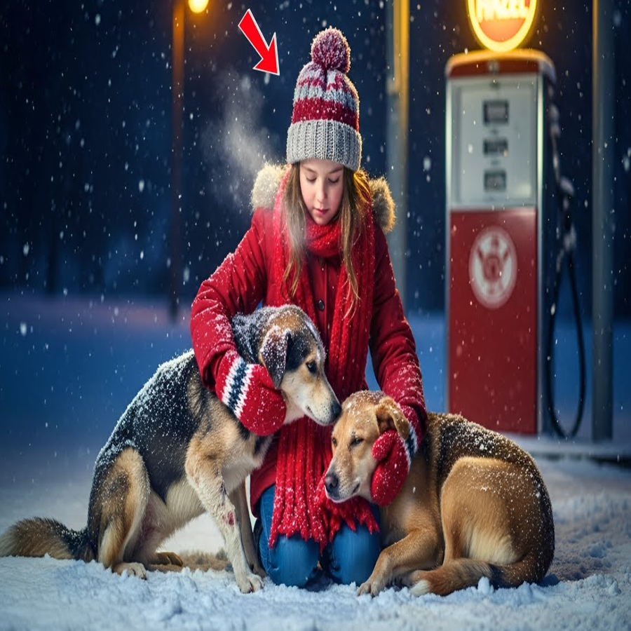 “Hello,” she called into the night, her mittened hands clutching the straps of her little backpack. “No answer, only another pitiful cry. closer now, trembling with pain. She followed it behind the old gas station where the snow piled high against the dumpsters. That’s when she saw them. Two dogs, maybe a year old, thin and shivering.