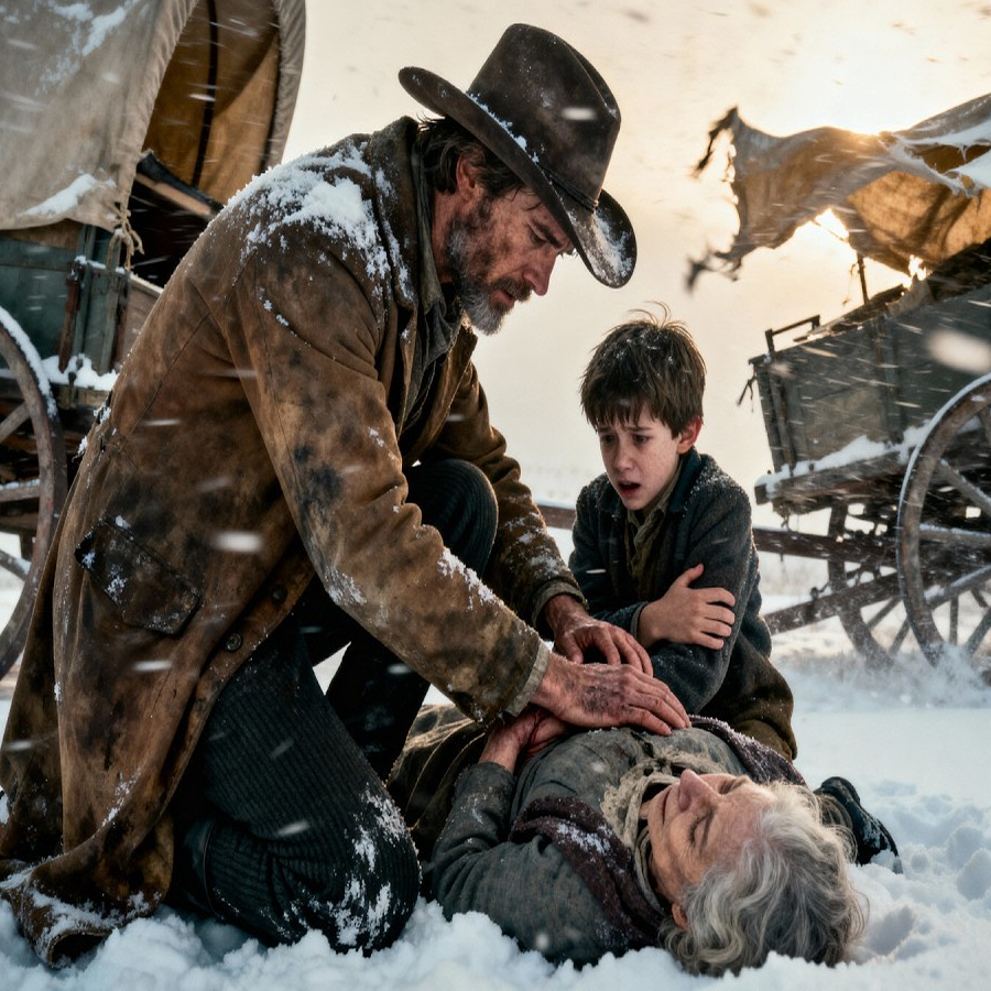 A small boy crouched beside a woman lying motionless in the snow. Please, the boy screamed when he saw Sam. Please don’t leave us. Sam dismounted, boots sinking deep. The woman was unconscious, her face pale as death, no horses, no supplies within reach, no help coming. He checked her pulse faint. But there, the boy was maybe 9 years old, shaking so hard his teeth chattered. She won’t wake up.