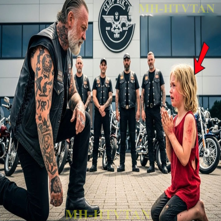 Mister, will you be my daddy? The six-year-old girl stood barefoot at the gates of the Iron Wolves clubhouse. Blood dried on her split lip, clutching a oneeyed teddy bear like it was the only thing keeping her alive. Her dress hung in tatters. Three days of dirt covered her tiny body. She stared up at the giant covered in tattoos and her voice cracked with desperation. I’ll be good. I promise I’ll be so good.