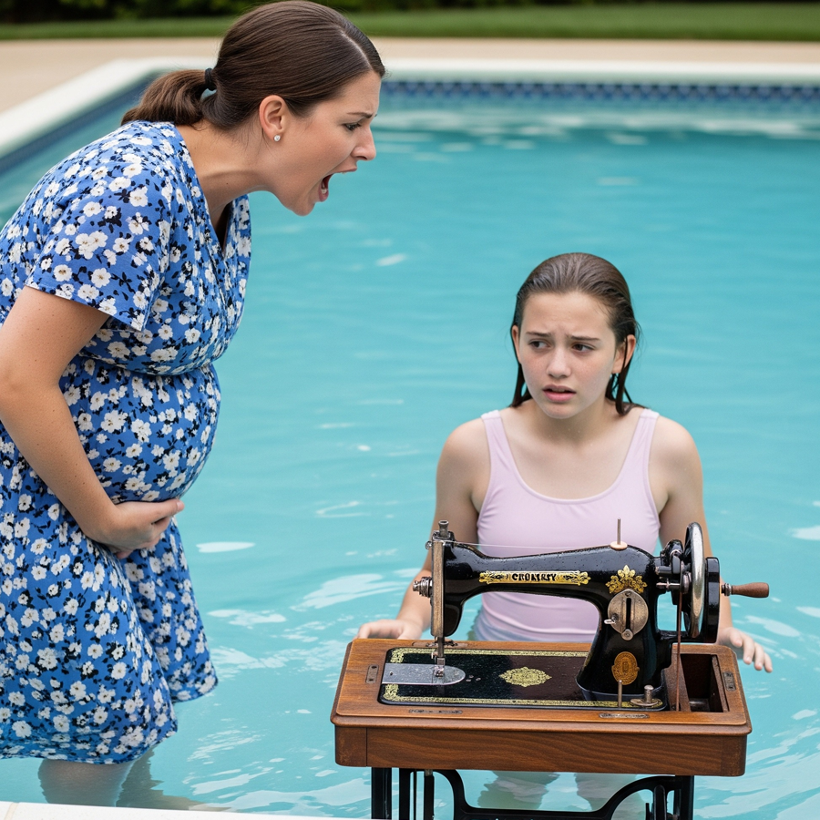 The sound of something heavy splashing into the pool cut through the quiet afternoon like a gunshot. For a second, I thought maybe a chair had fallen in, or one of the dogs had jumped after a ball. Then I saw it — the white and pink sewing machine sinking slowly through the water, bubbles trailing up as the light caught the metal needle plate. My daughter, Lily, screamed.