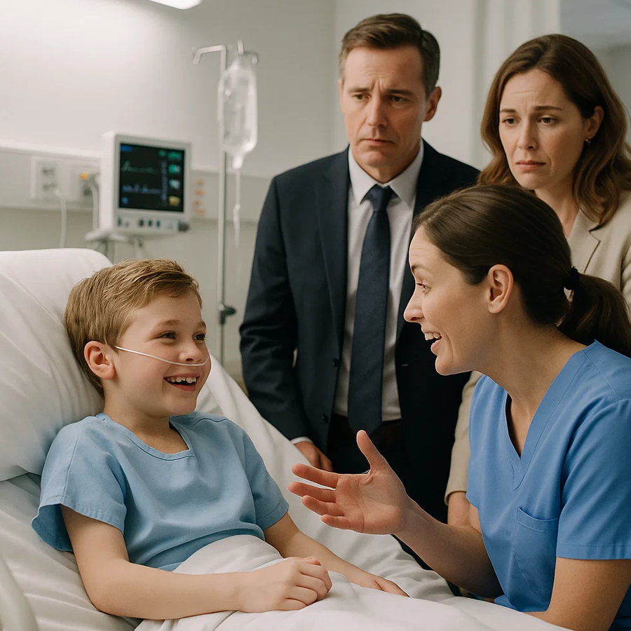 She froze in the doorway. The boy’s face twisted in agony, his silent cries stabbing straight into her chest. The doctors looked exhausted, their eyes on charts instead of the child. His father looked furious and helpless at once, a man used to solving problems with money now facing something it couldn’t fix.