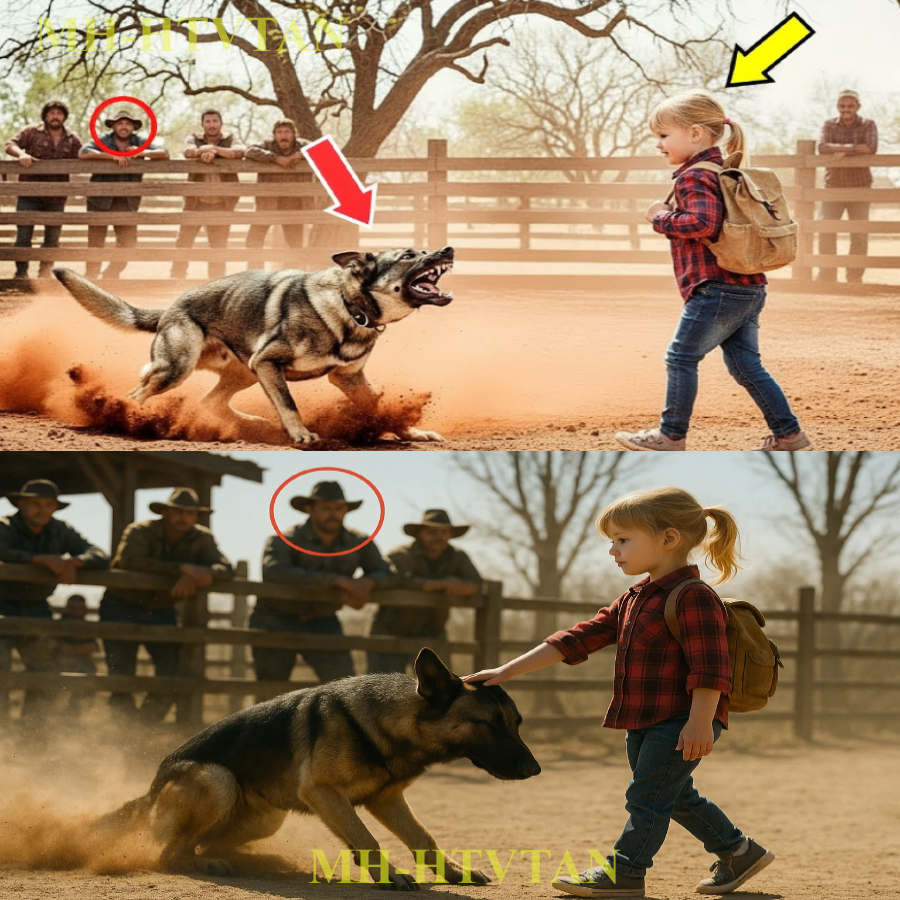 A stunned silence fell over the ranch, so heavy and absolute that even the wind seemed afraid to move. The dust settled slowly around Rex and the little girl, drifting like red mist between them. Every ranch hand stood frozen behind the fence, eyes wide, mouths halfopen, their bodies locked in disbelief. Rex wasn’t growling. He wasn’t snarling.