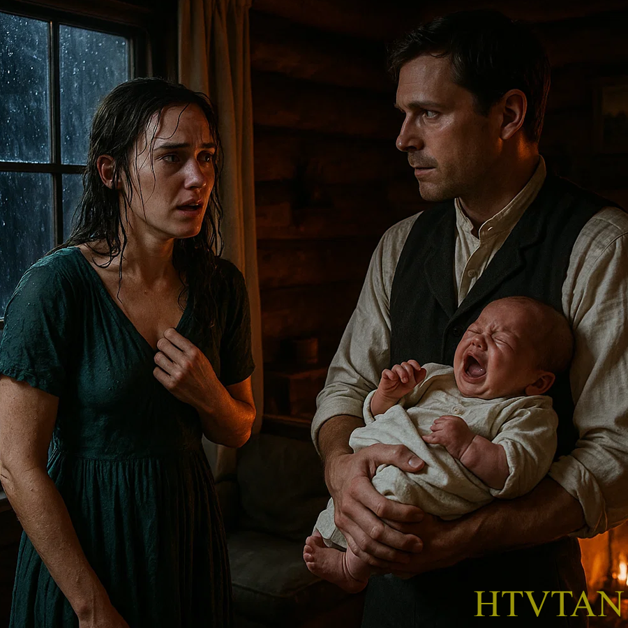 It was faint at first, barely audible over the rain. Then again, louder this time, steady and firm. Elias froze. No one came out this far, not in weather like this. With the baby clutched to his chest, he opened the door. Standing there in the rain was a woman wrapped in a soaked cloak, her hair plastered to her face, her breath clouding in the cold air.
