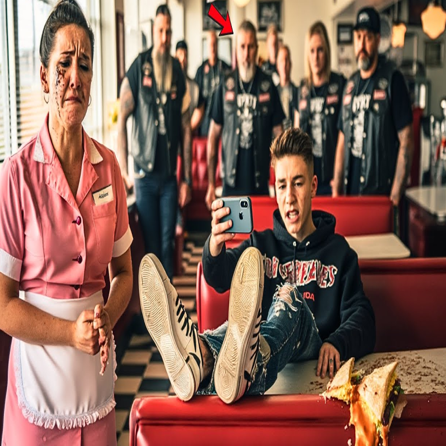 Jenny Martinez had been on her feet for 11 hours straight. Her son needed medicine. Her rent was 5 days late. And now this spoiled kid wearing shoes that cost more than her car just spit in her face for bringing him the wrong sandwich. Table 9 went silent. The brotherhood wasn’t supposed to be there that morning. It was chance.