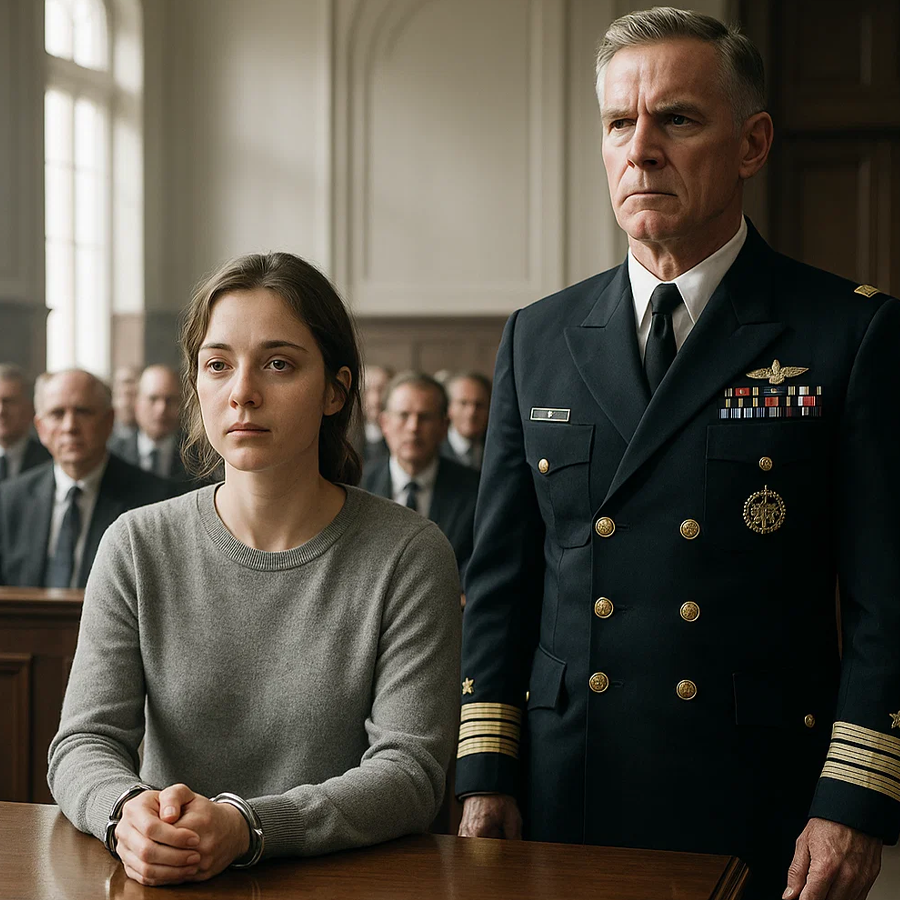 She didn’t resist when they handcuffed her at the shooting range. No badge. No explanation needed. Just a quiet woman hitting impossible targets who refused to identify herself. The small-town courtroom prepared for a routine arraignment until heavy doors swung open. A Navy admiral in full dress uniform walked silently down the center aisle.