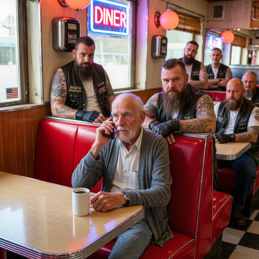 Sally’s hand trembled slightly as she set down the coffee pot. The other customers avoided looking outside, their conversations fading to a whisper. Walter remained at his counter seat, calmly cutting into his pancakes as the door swung open. The bell’s cheerful chime felt oddly out of place as five leather-clad figures swaggered in. The leader’s boots hit the linoleum with deliberate heaviness as he approached the counter, brushing Walter’s shoulder as he passed.