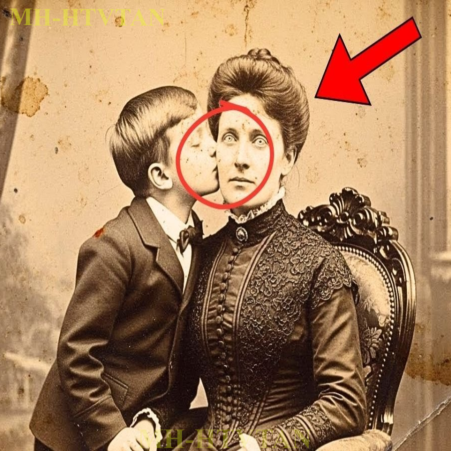 In September 1895, in a quiet Victorian home in Philadelphia, Pennsylvania, a professional photographer captured what appeared to be one of the most tender moments in family photography. A young boy, approximately 5 years old, leaning in to kiss his mother’s cheek. The mother sat in an elegant chair, her eyes open, looking toward the camera with a serene expression.