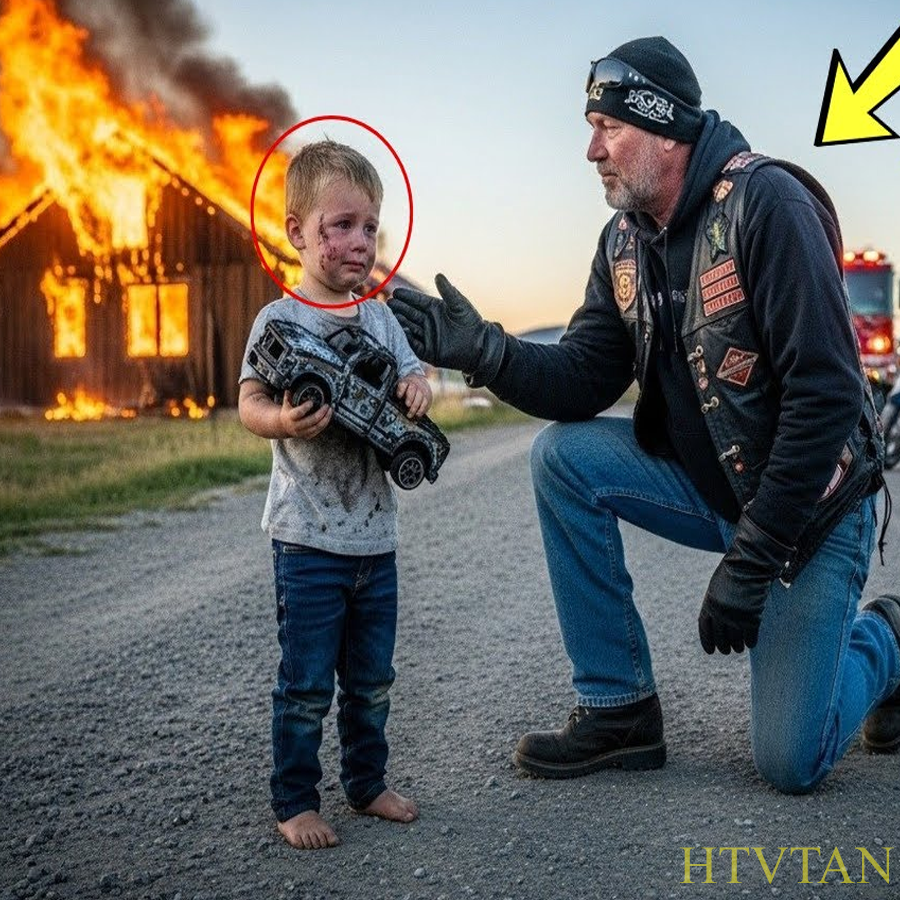 The night cracked open with sirens and smoke. A small boy stood barefoot on the gravel road, clutching a charred toy truck. Behind him, flames devoured what once was home. They burned it. He sobbed, trembling in the red glow. From the darkness, engines rumbled low steady and coming closer.