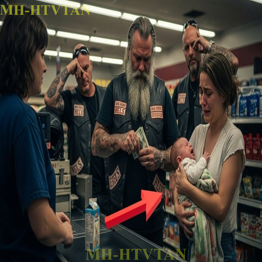 She stood in that convenience store, $7 in her wallet, her baby screaming from hunger, her credit card declined, and absolutely no way out. Every customer avoided her eyes, except the three massive men in leather vests with hell’s angels across their backs, the ones she’d been taught to fear her entire life, the ones who were walking straight toward her with expressions she couldn’t read.
