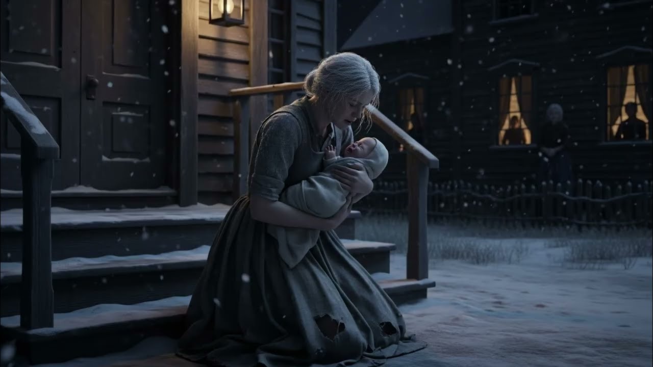 The snow came down like a curtain of silence, each flake slow and deliberate, as if heaven itself sought to cover the shame of what was happening in the street. Evelyn stood barefoot on the frozen boards of the porch, her newborn wrapped against her chest, the infant’s cries piercing the cold like a wound.