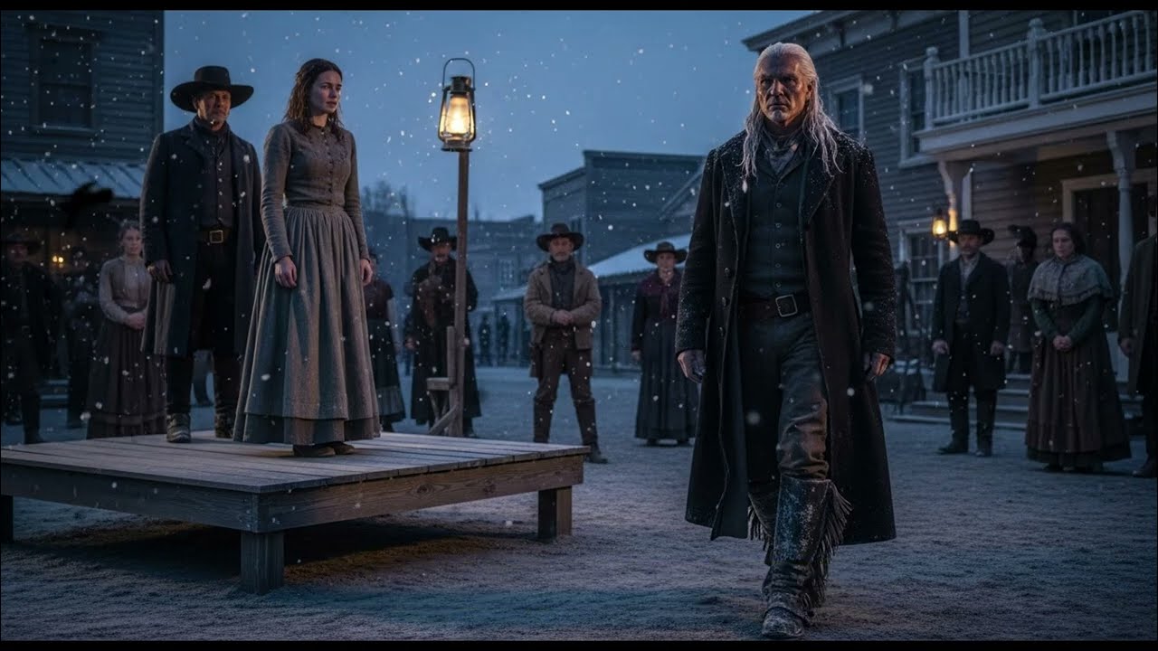 He did not seize her arm or drag her from the platform. Instead, he reached out, lifting her down from the block as though she were fragile glass. His hands, scarred but steady, supported her with care. The crowd watched in silence. Snow continued its patient descent, covering boots, hats, and shoulders, muffling the whispers that tried to stir again.