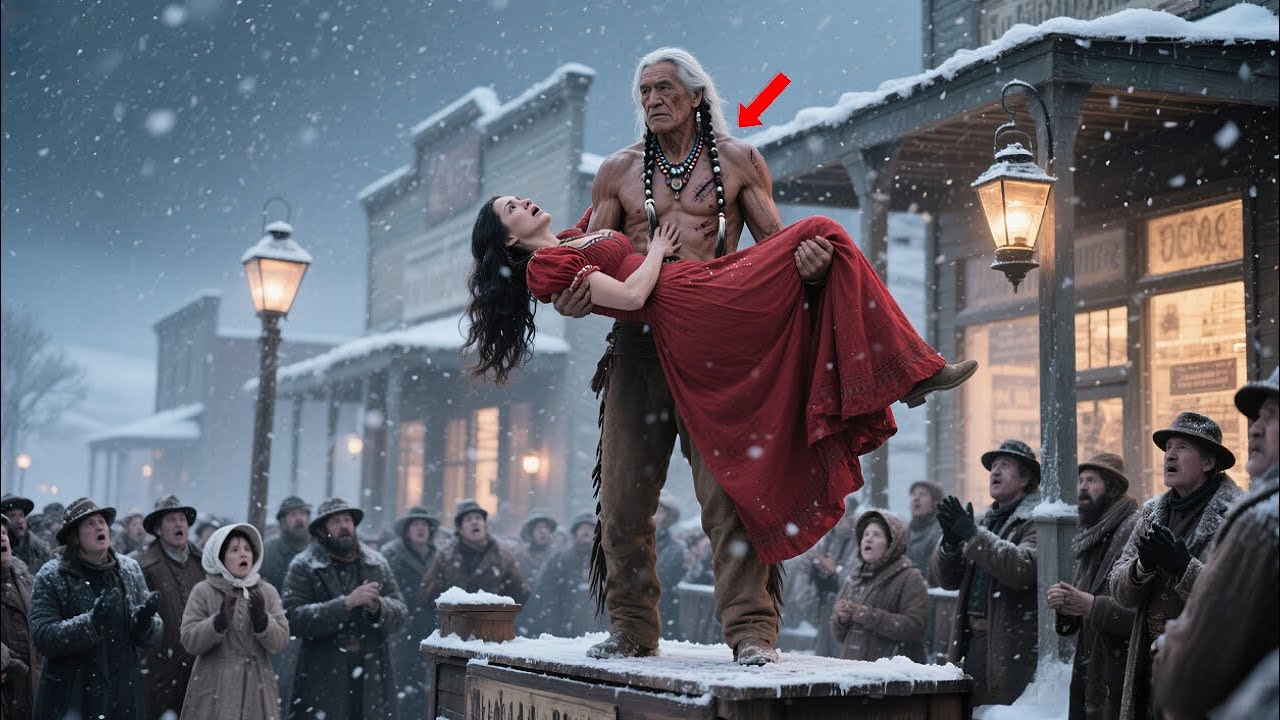 Sheriff Amos busied himself gathering coins, avoiding the weight of what had just unfolded. Elizabeth, still trembling, looked at the tall Apache beside her. Her shame and the knight’s cruelty pressed heavy. Yet beneath it pulsed something else, something she could not name. It was not rescue nor ownership. It was a beginning carved into snowfall. As Nantan guided her through the crowd, their footsteps muffled in fresh snow.