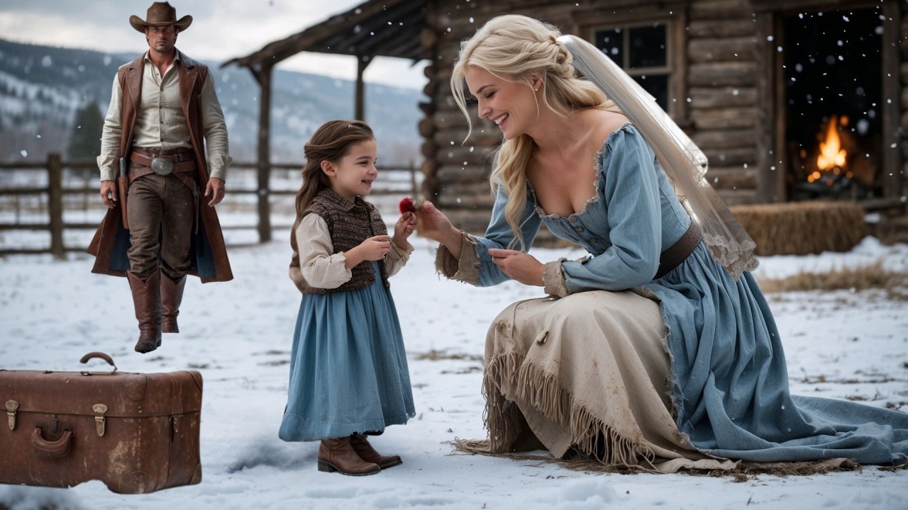 Annabelle Sinclair pulled her wool shawl tighter against her throat, boots crunching through the deep snow as she approached the dark silhouette of a ranch house. Her gloved hand trembled as she raised it to knock. Before her knuckles could touch the wood, the heavy door creaked open. A tall man filled the frame.