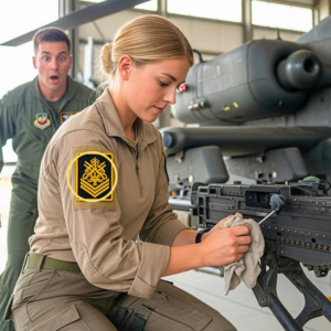 At a forward operating base deep in the desert, a quiet woman moves alone through the hanger, meticulously cleaning the 30mm chain gun…