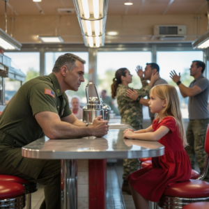 In a small town diner, a seven-year-old girl watched three soldiers corner a lone woman at the counter. The entire room stayed silent…