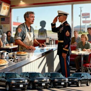 The diner went silent. Dead silent. 12 customers frozen midbite, mid-con conversation, mid everything. A man in full military dress uniform stepped out of the lead vehicle. Stars on his shoulders catching the morning light. Rows of metals across his chest. Two officers in identical uniforms flanked him as he walked toward the entrance.