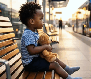 The bus station was nearly empty at 9:00 on a cold November evening. A small boy sat alone on a wooden bench, his twisted legs tucked beneath him, clutching a worn teddy bear to his chest. He was maybe 5 years old with dark skin and eyes that kept searching the darkness, waiting for someone who would never come back.
