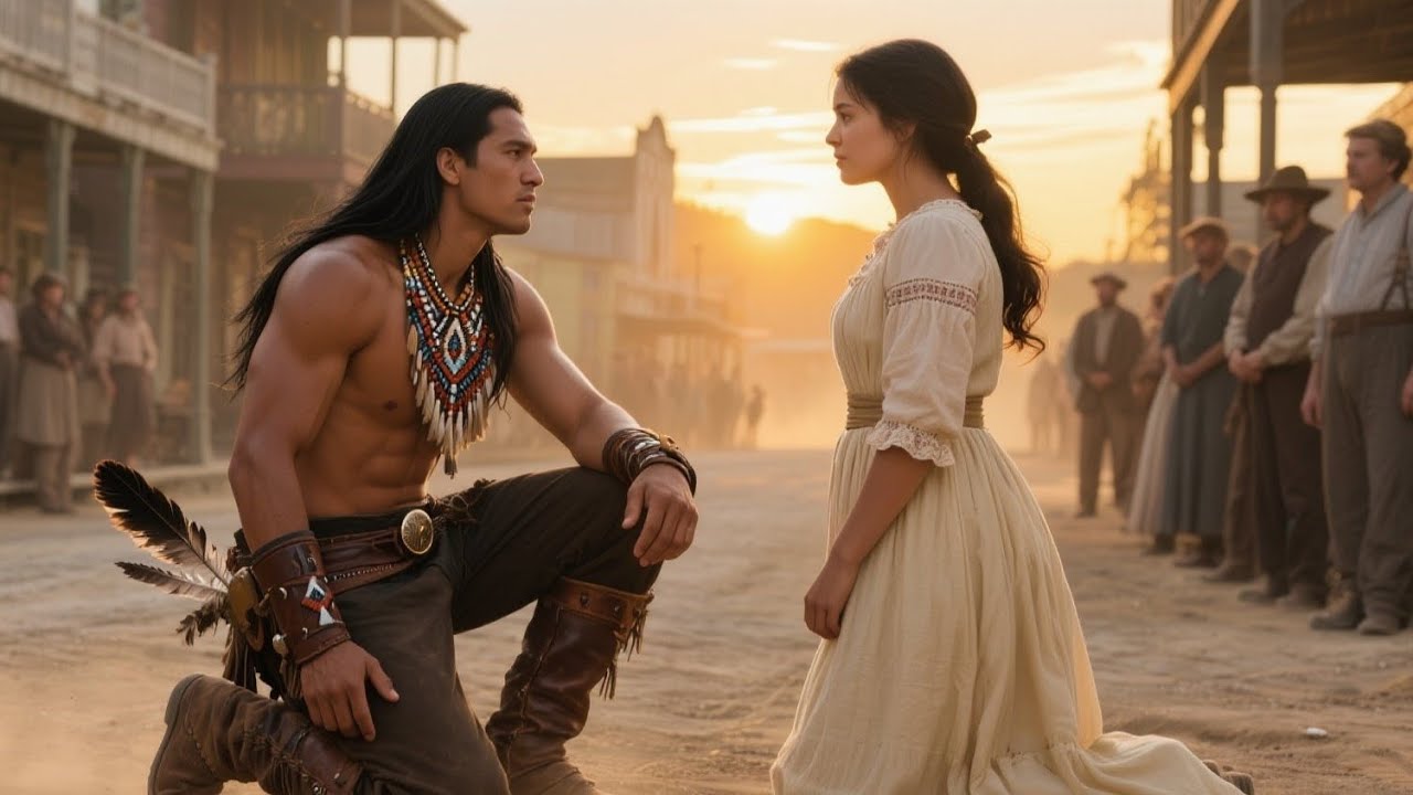 cliff, gazing out over the desert plains. The wind tugged at his long hair, and the fading light painted his face in shades of amber and bronze. You should rest, she said softly, stepping beside him. I rest when the land does, he replied, his voice low. There are still men who hate what they cannot understand. She sat beside him, her skirts brushing his leg.