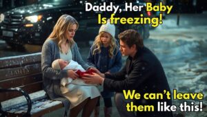 They were almost to the parking lot when Emma stopped. “Daddy, wait.” Her small voice trembled. She pointed toward a park bench half buried in snow. Michael followed her gaze. A young woman sat hunched on the bench, clutching a bundled newborn. Her coat was thin, her hair damp with melting snow. Beside her, a worn duffel bag sagged against the bench leg.