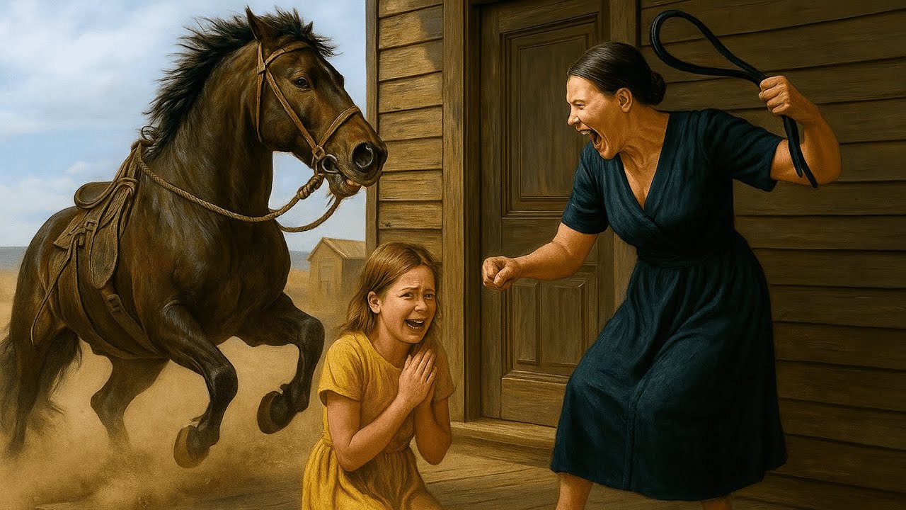 The woman seemed to enjoy the fear that flickered across Lily’s face each morning. Shadow restlessly stamped his hooves, his ears pointed back toward the house. The stallion had been watching this pattern for months. The child’s terror, the woman’s cruelty, the man’s absence. Something deep inside the animal was building up. a protective feeling that went beyond just being a tamed horse.
