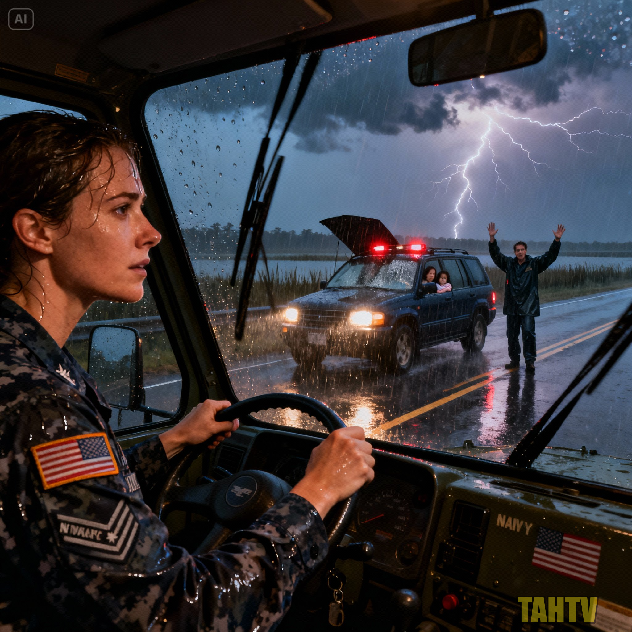 Behind him, through fogged glass, I caught a glimpse of a woman and a small child huddled together. My stomach tightened. Civilians stranded in the middle of nowhere during a category 2 storm. “Keep going,” I told myself. “Base is only 30 mi away. You’ll call it in once you’re safe.” But I didn’t accelerate.