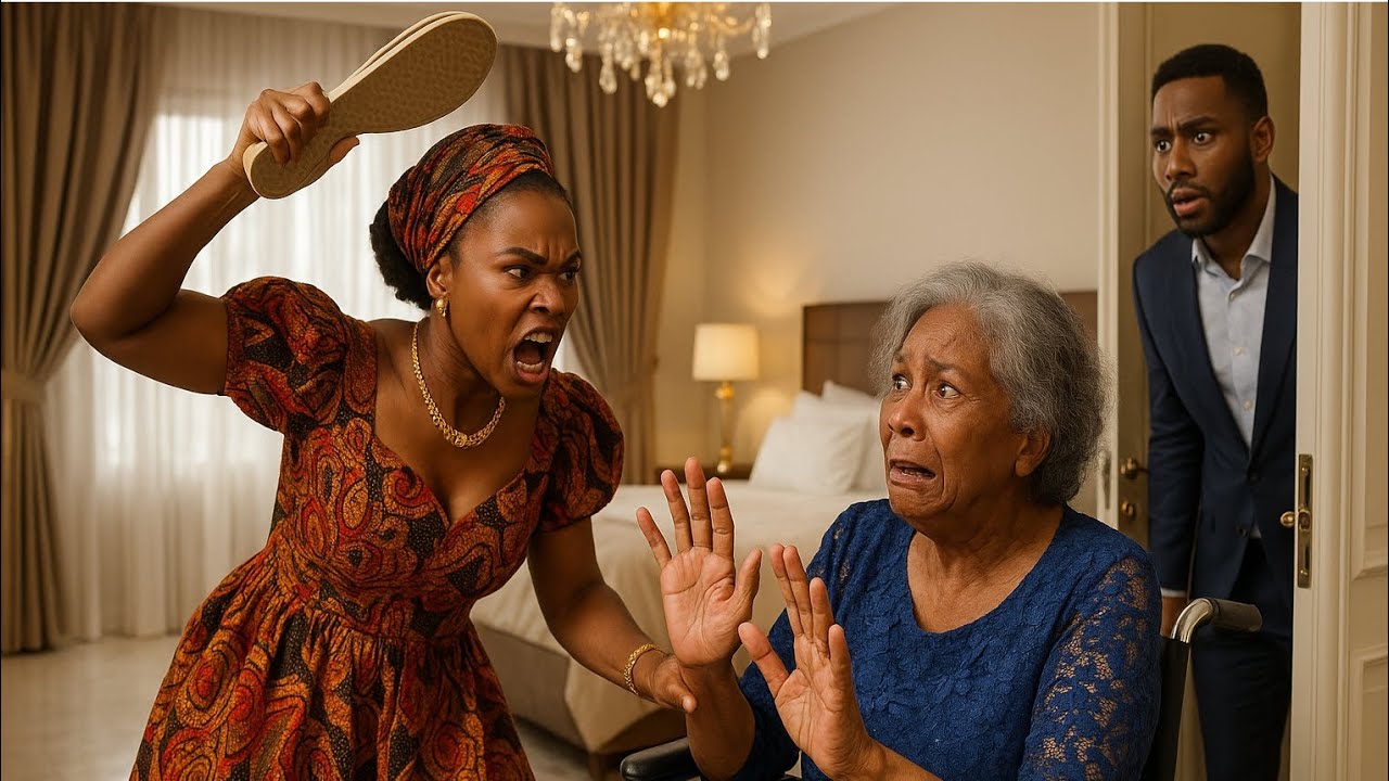 He turned it slightly and opened the door just enough to see inside. What he saw almost tore his heart in two. Olivia, his wife, stood over his mother with one hand bracing a wall and the other hand raised high, holding a bathroom slipper. Madame Madana was in her wheelchair, hands trembling, gray scarf loose around her head. Her eyes were wet with tears.