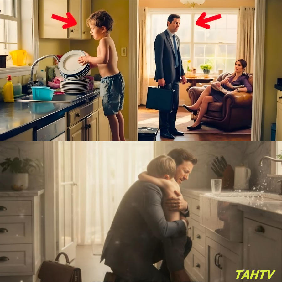 His heart longed to see his little boy, his reason to keep going. He expected laughter, the echo of tiny footsteps running to him. Instead, he heard the sound of clinking dishes. Confused, he followed the faint sound into the kitchen. There, standing on a wooden stool, was his 5-year-old son, sleeves rolled up, hands trembling as he scrubbed heavy dishes with soap.