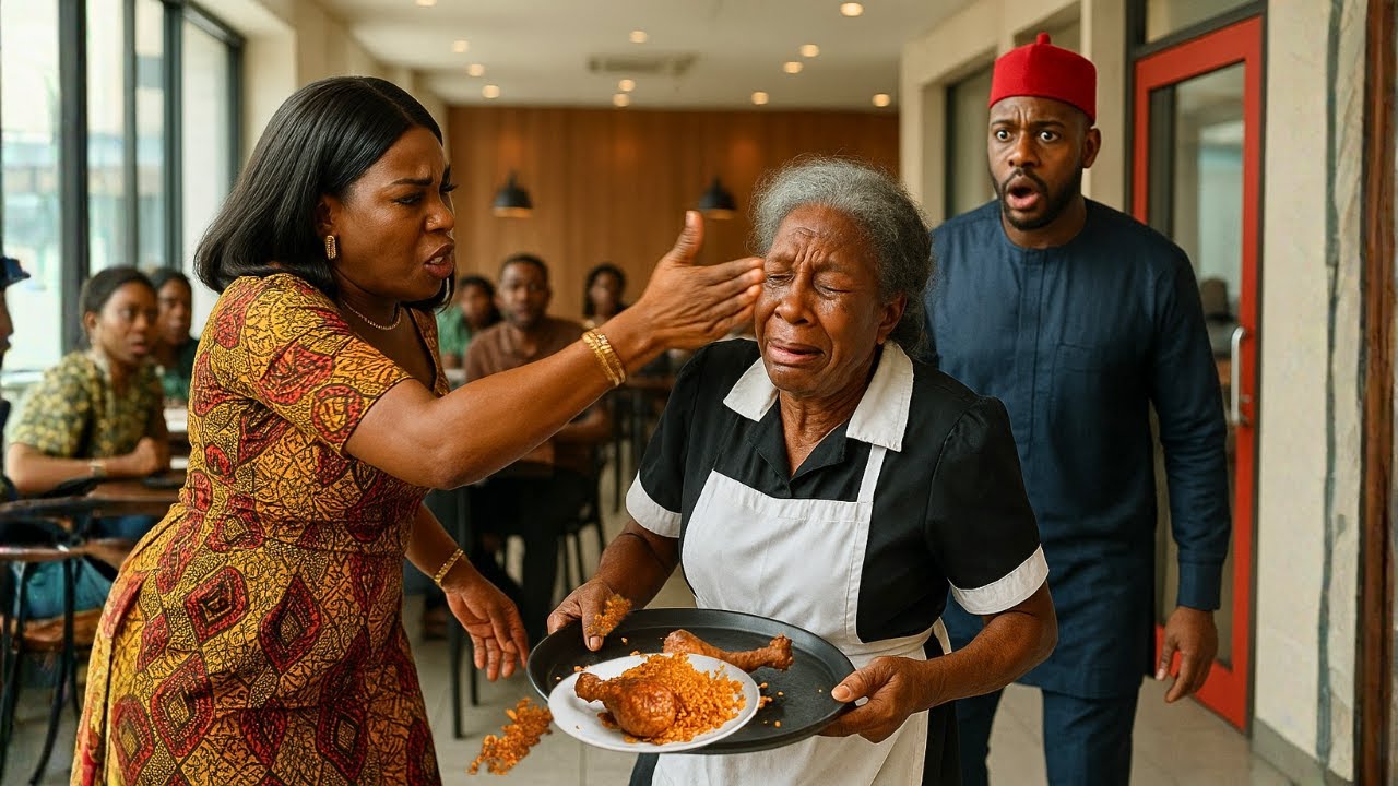 The sound came like thunder in a quiet sky. One sharp slap echoing across the restaurant. Plates rattled. People stopped talking. Madame Hannah staggered, the tray of Jolof rice and chicken she was carrying shattered on the floor. Her palm pressed to her cheek, eyes wet and wide. Get out of my way. Agnes snapped, breath hot with anger. You slow old woman.