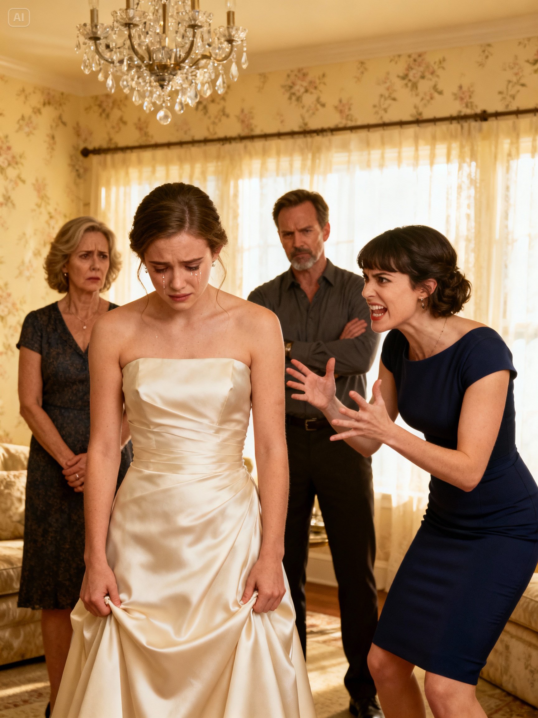 Natural makeup, soft waves, a simple blue blouse. Nothing extravagant, just enough to look like someone who no longer needed anyone’s approval. When I walked down the stairs, Dad was already waiting in the living room like he was rehearsing a speech. Mom sat stiffly beside him, hands folded tight. Brooke paced the room like a hamster on espresso.