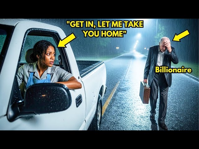 All she wanted was warmth and silence. Then she saw it. A black luxury sedan parked crooked on the roadside. Hazard lights blinking weakly through the downpour. The hood was up, steam rising in thin, desperate curls. As she slowed, her headlights caught the outline of an elderly white man standing beside the car, coat drenched, one hand on the fender for balance.