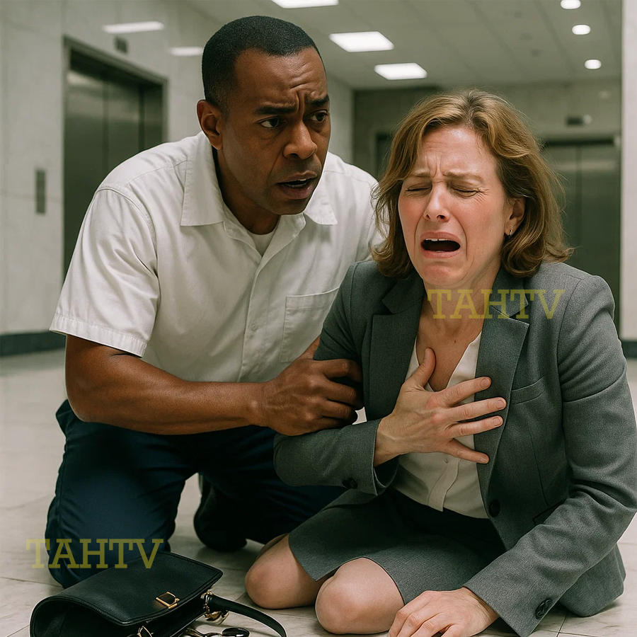 Emma, and a promise to teach her that good people still existed in this world. He dropped his mop with a clutter that echoed through the empty marble lobby and ran toward the sound. His worn sneakers squeaked against the polished floor as he rounded the corner to the executive elevator bank where a woman in an expensive blazer was crumpled on the ground, clutching her chest, her face twisted in agony.