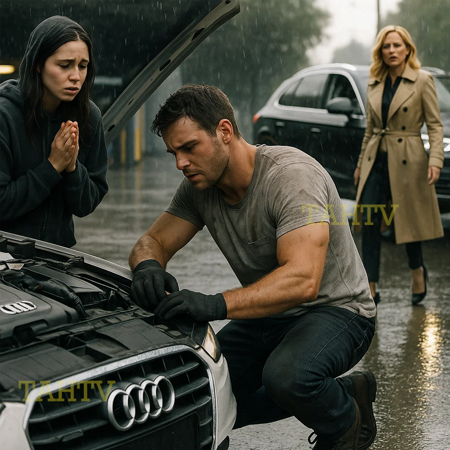 Following her through the rain, Jack found himself at a sleek white Audi convertible new model, probably worth more than his entire business. The contrast between the luxury vehicle and the girl’s obvious distress struck him as peculiar. This wasn’t just about a flat tire. “I’m Jack,” he offered, kneeling beside the vehicle to examine the tire, which wasn’t just flat, but shredded.